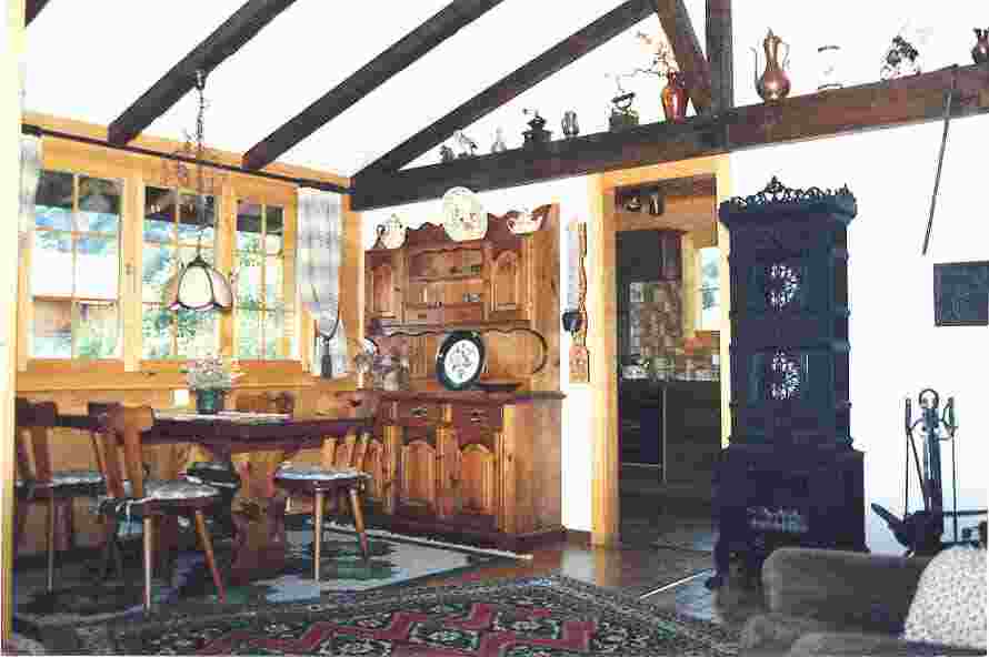 mit Wohn - und Essecke , Radio , Kassettenrecorder , Farbfernseher mit Fernbedienung und SAT - TV , gusseiserner Kaminofen